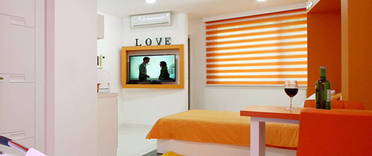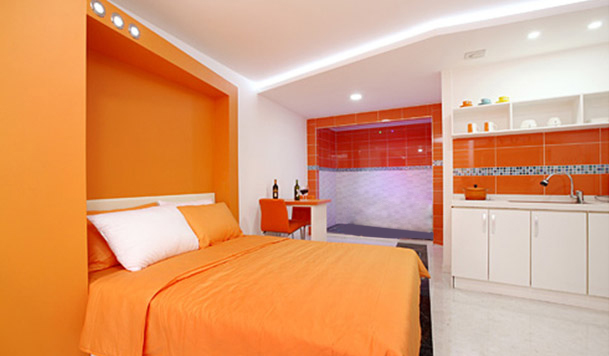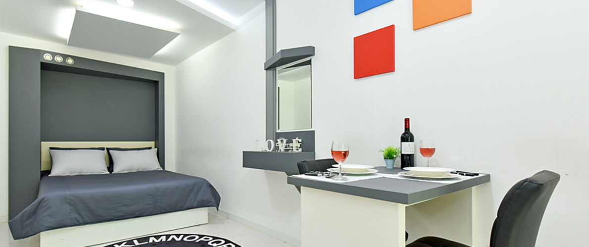 침대, 에어컨, TV, Wi-Fi, 식탁, 냉장고, 전자레인지, 커피포트, 핫플레이트, 주방집기일체