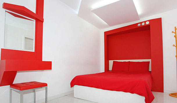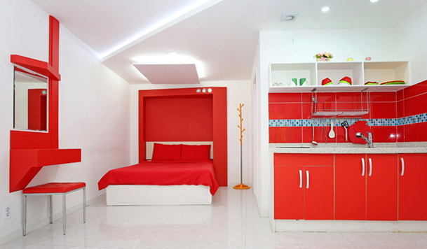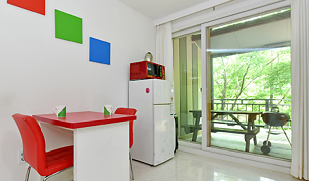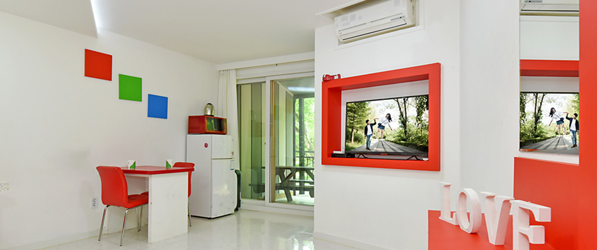 침대, 에어컨, TV, Wi-Fi, 식탁, 냉장고, 전자레인지, 커피포트, 핫플레이트, 주방집기일체
