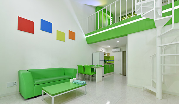 침대, 쇼파, 탁자, 에어컨, TV, Wi-Fi, 식탁, 냉장고, 전자레인지, 커피포트,핫플레이트, 주방집기일체