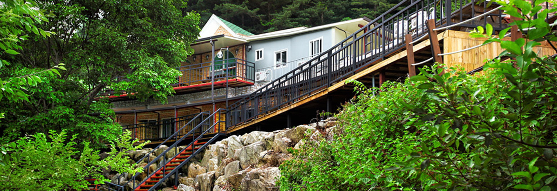 저희 펜션의 특징은 펜션의 객실 앞에 시원한 폭포를 품은